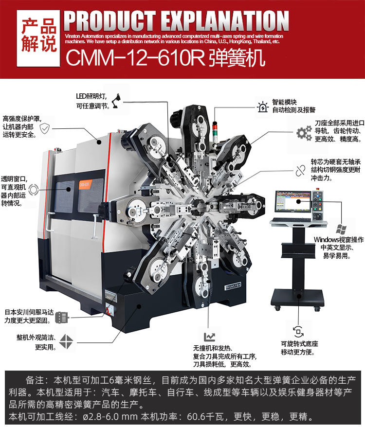 本機型適用于汽車、摩托車、自行車、線成型等車輛以及娛樂健身器材等產(chǎn)品所需的高精密彈簧產(chǎn)品的生產(chǎn)。